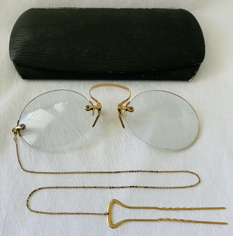 Title (ebay affiliate link): ANTIQUE Gold Tone / Filled? PINCE Nez Tinted SPECTACLES w/ Hairpin Chain & Case