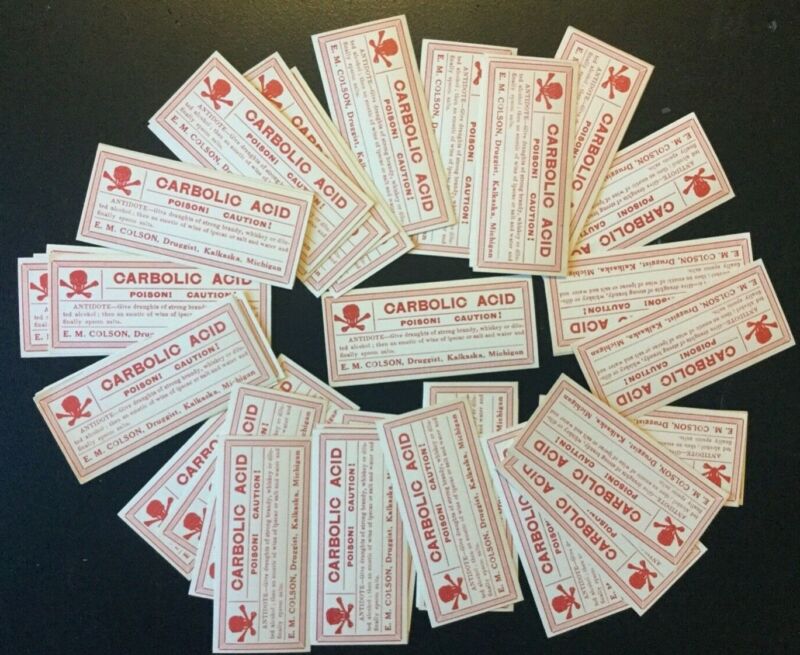 Title (ebay affiliate link): 40+ Vintage Pharmacy Drug Store CARBOLIC ACID POISON LABELS - early/mid 1900''s
