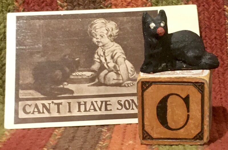 Antique Black Cat Figure w Old Toy ABC illus Wood C Block & Postcard -HALLOWEEN