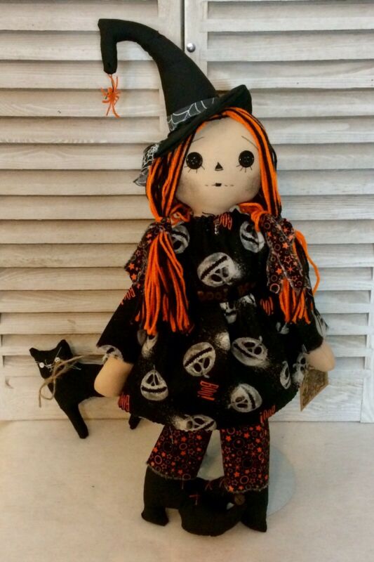 Title (ebay affiliate link): Primitive Witch Doll Halloween with Kitty Cat "Beatrix and Boo" Shelf Sitter