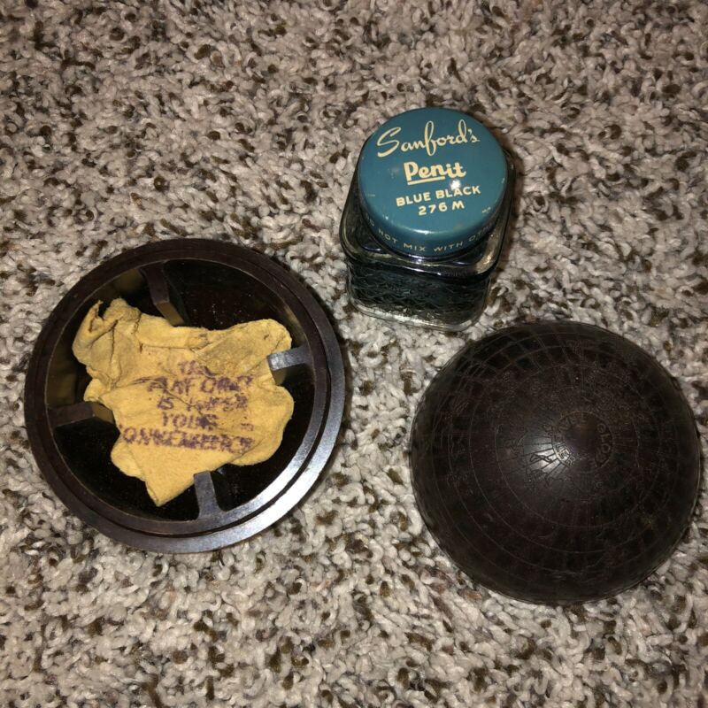 Title (ebay affiliate link): Vintage Sanford Globe Traveler World Inkwell Ink Bottle Holder Case Chicago NY
