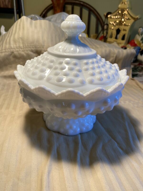 Title (ebay affiliate link): CS8489 Vintage Fenton Hobnail White Milk Glass Pedestal Covered CANDY DISH BOWL