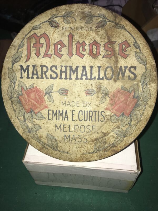 Title (ebay affiliate link): "Melrose Marshmellows Made by Emma E. Curtis Melrose Mass." Tin Vintage