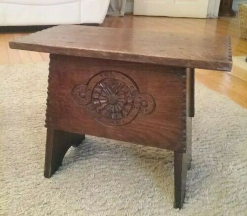 Title (ebay affiliate link): Antique Carved Oak Stool Seat Occasional Table Lamp Plant Stand Arts & Crafts