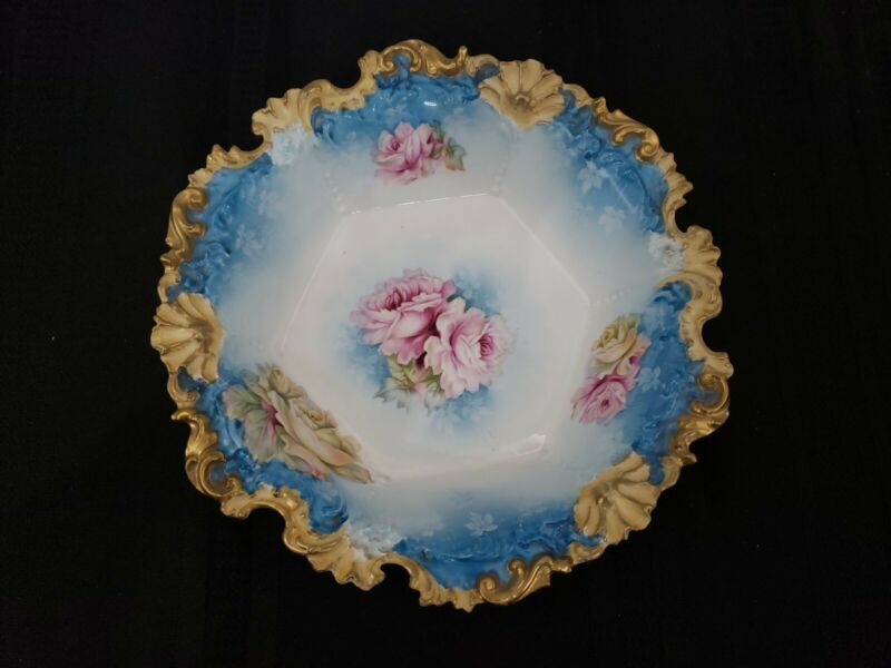 Title (ebay affiliate link): Vintage Gold & Blue Prussian Bowl with Unique Shape and Molded Border Unmarked