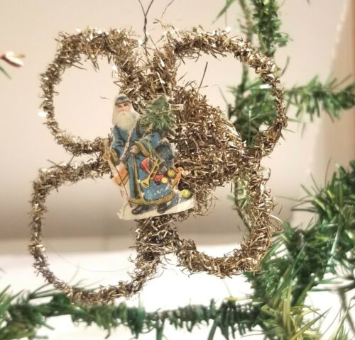 Title (ebay affiliate link): Blue Suited Santa Claus. Tinsel. Late 1880s Double Sided Tinsel & Paper Ornament