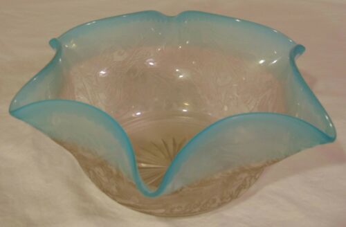 Victorian Brides Epergne Basket Bowl Art Glass Etched Cut Blue Rim Compote