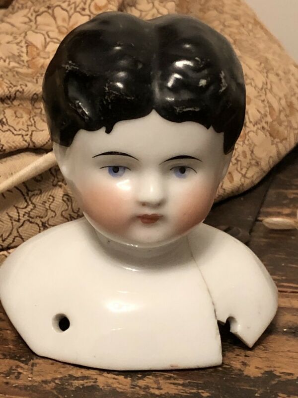 Title (ebay affiliate link): Antique ? Molded Black Hair Blue Eyed Porcelain Shoulder Head 3 1/2"