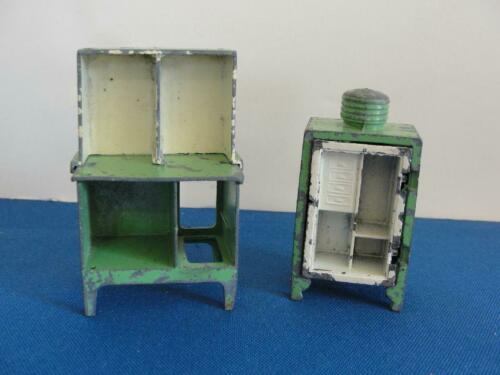 2 Tootsie Toy Green White Doll House Furniture 2 pc Hoosier & Refrigerator