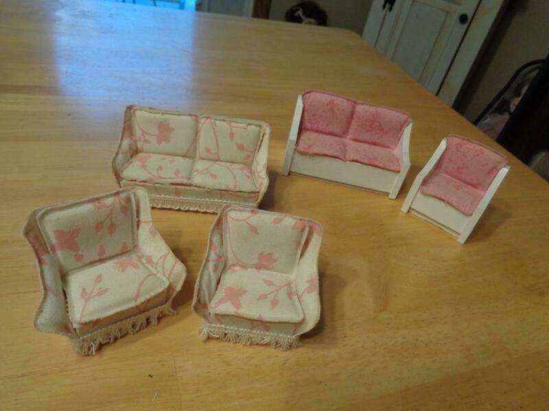 Vintage Lundby? Doll House Wooden/Cloth Doll House Furniture~2 Couches~3 Chairs~