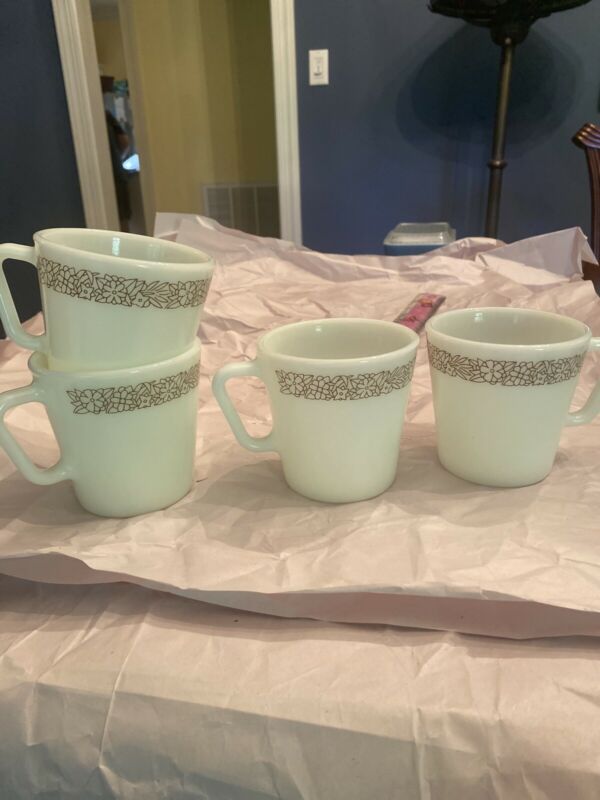 Title (ebay affiliate link): Set of 4 Vintage Pyrex Coffee Cups Mugs Woodland #1410 D Handle Opal White Brown
