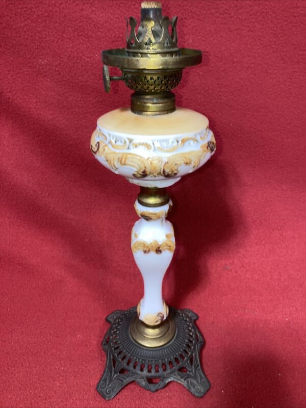 Vintage Kerosene Oil Lamp with Porcelain Milk Glass Cameo Style base P&A Victor
