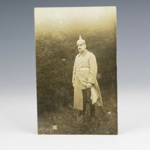 Title (ebay affiliate link): World War One German Soldier In Long Coat & Pickelhaube - Great War RP Postcard