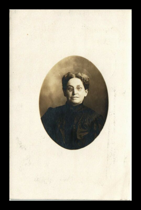 Title (ebay affiliate link): US POSTCARD RPPC PORTRAIT OF LADY WITH GLASSES WEARING HIGH NECK SILK TOP