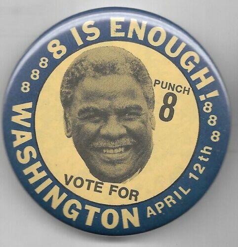 Title (ebay affiliate link): HAROLD WASHINGTON, PUNCH 8 CHICAGO POLITICAL CAMPAIGN PIN