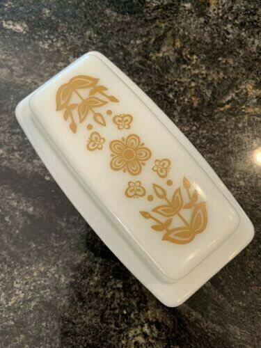 VTG Corelle Pyrex BUTTERFLY GOLD Covered Butter Dish Made in USA