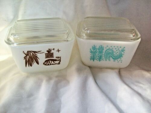 Title (ebay affiliate link): 2 Vtg Pyrex Turquoise Butterprint 1 1/2 Cup Refrigerator WLids- Cat Corn,Wheat