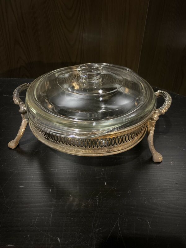 Vintage Round Metal Warming Server With Pyrex Bowl