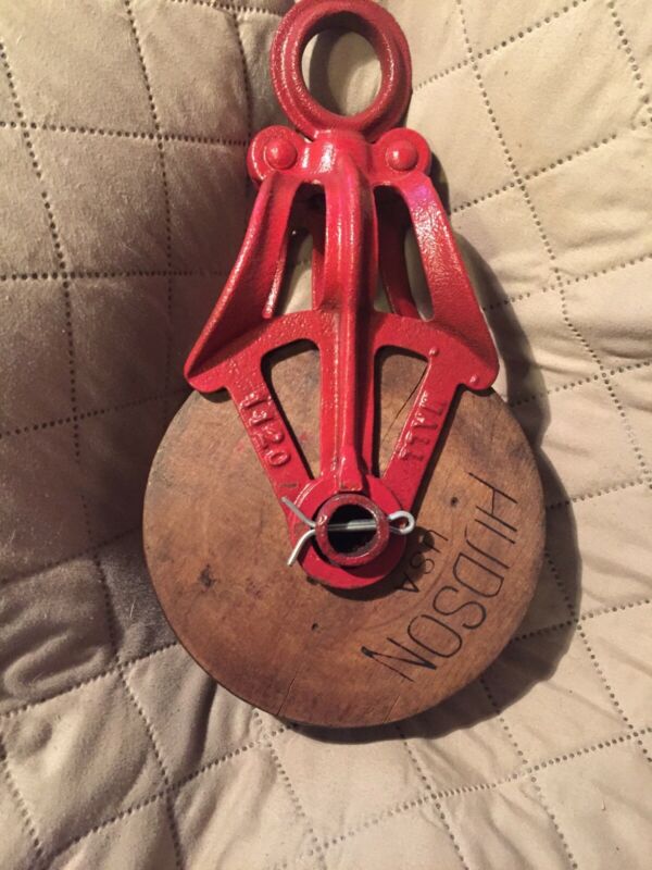 Title (ebay affiliate link): VINTAGE PULLEY HUDSON MFG CO BLOCK & TACKLE FARM BARN TOOL WOOD IRON Post-1905