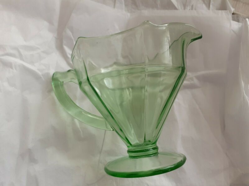 Title (ebay affiliate link): Footed scalloped Vintage Green Depression Glass Creamer 6 Point Webbed Rim