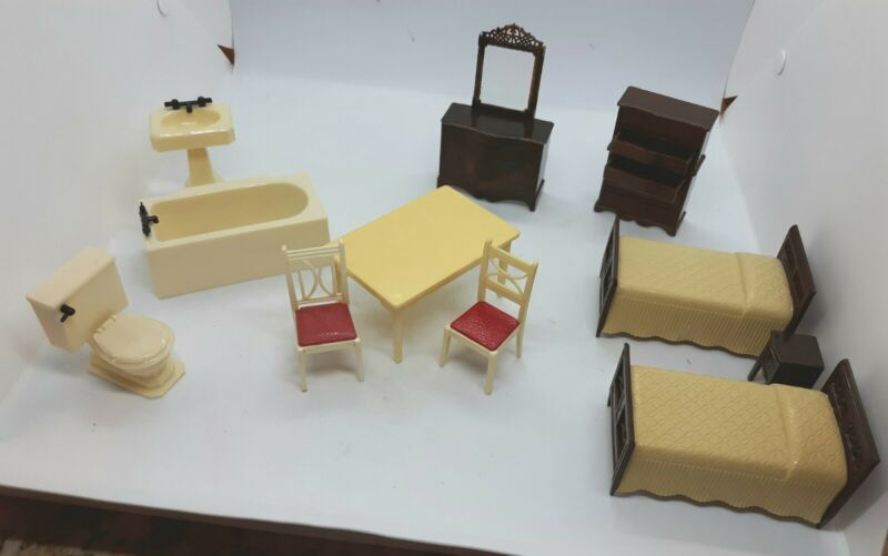Title (ebay affiliate link): VINTAGE RENWAL PRODUCT DOLL HOUSE FURNITURE (11) BEDROOM '' BATH '' TABLE & CHAIRS