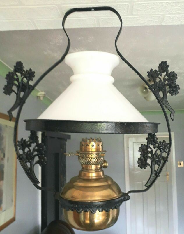 Title (ebay affiliate link): Vintage Brass Hanging milk glass oil lamp with black decorative hanger NO glass