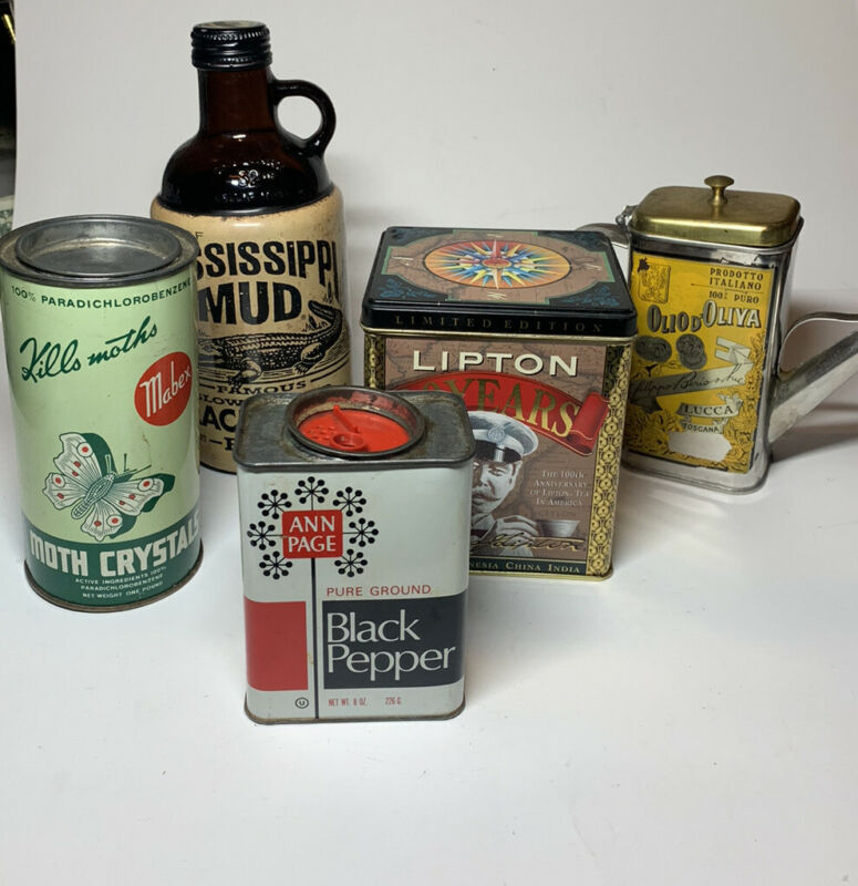 Title (ebay affiliate link): Lot #4 x5 Vintage Tins Packaging Boxes Antiques Bottles Mississippi Mud Lipton