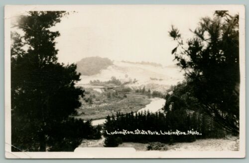Title (ebay affiliate link): Ludington Michigan~State Park~Birdseye Panorama Dam @ Hamlin Lake~1946 RPPC