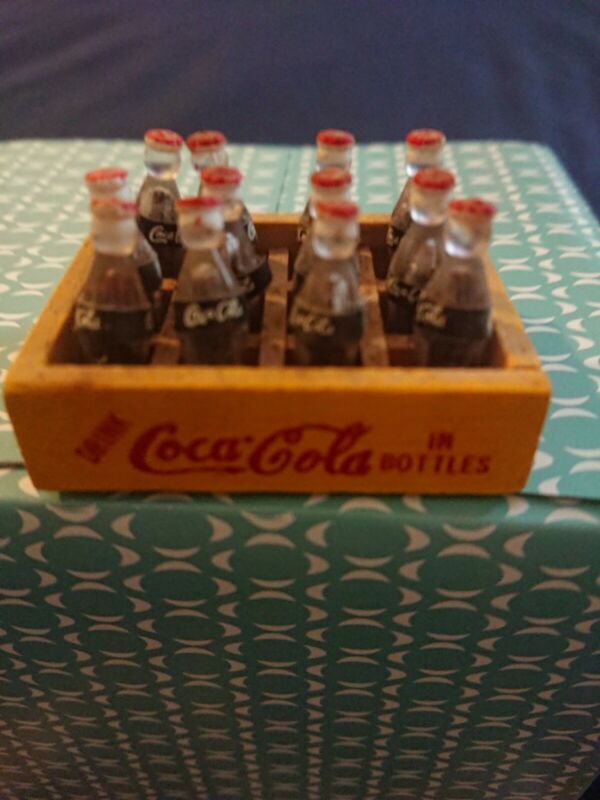 Title (ebay affiliate link): Miniature wood yellow Coke case red Coca Cola 12 plastic bottles 2" case