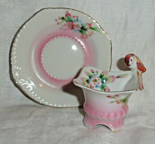 Vintage Japan Miniature Mini Tea Cup & Saucer Bird Red Parrot Handle Pink Flower