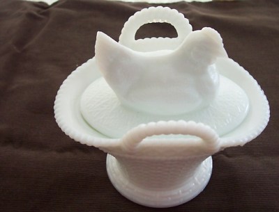 WESTMORLAND HEN ON BASKET COVERED DISH MILK GLASS