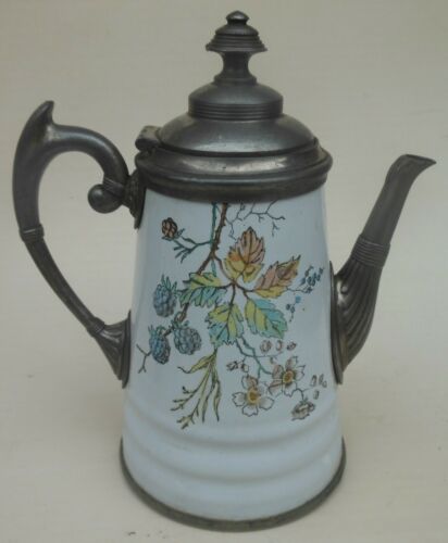 Very Good Antique Graniteware & Pewter Teapot With Flowers & Berries