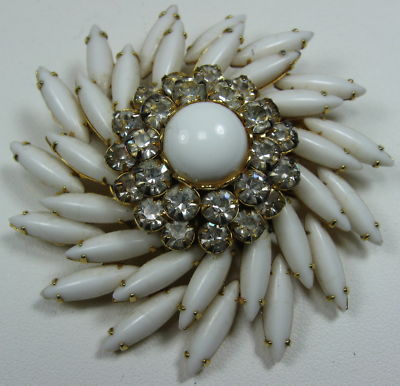 Vintage Judy Lee Milk Glass Clear Rhinestone Brooch Pin