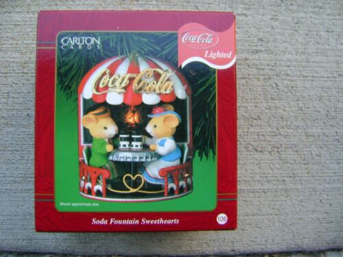 Title (ebay affiliate link): NIB Carlton Cards Coca Cola Lighted Christmas Ornament Soda Fountain Sweethearts