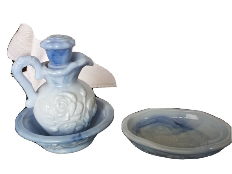 Vintage Avon blue milk glass pitcher , bowl and soap dish 1978