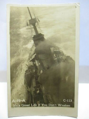 WWI A.R.A. REAL PHOTO POSTCARD W/ LOGO GREAT LIFE IF YOU DONT WEAKEN, BATTLESHIP