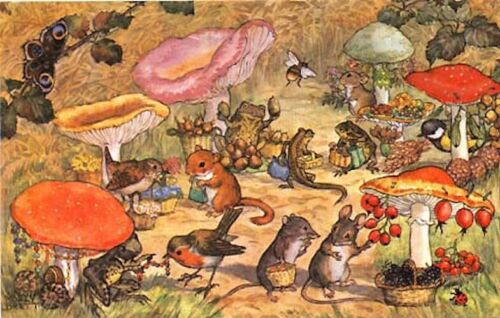 Title (ebay affiliate link): Molly Brett Postcard Toadstool Market Mice Mushroom Frog Animals Medici