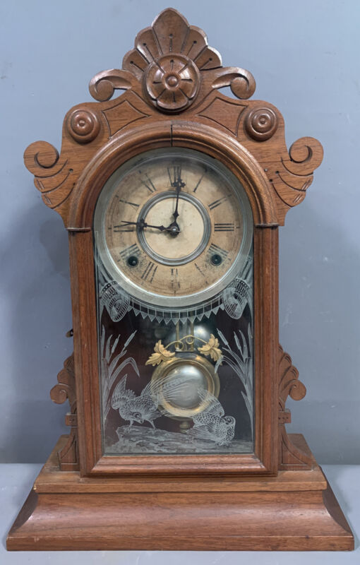 Title (ebay affiliate link): Antique EDWARDIAN Era KITCHEN Style WOOD Faux ETCHED Wild Birds MANTEL Old CLOCK