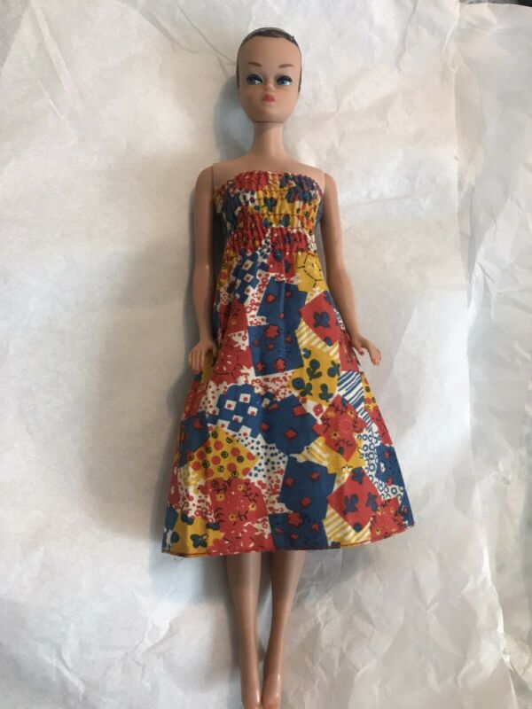 Title (ebay affiliate link): Vintage Barbie Doll Dress Strapless Patchwork Print 1970''s Smocked Top Colorful!