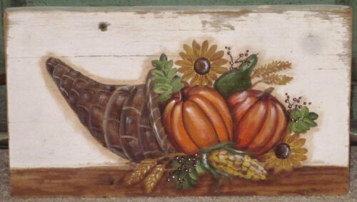 *~*PRIMITIVE*~* HP FOLK ART PRIM CORNUCOPIA * PUMPKINS * CORN *~* RECLAIMED WOOD