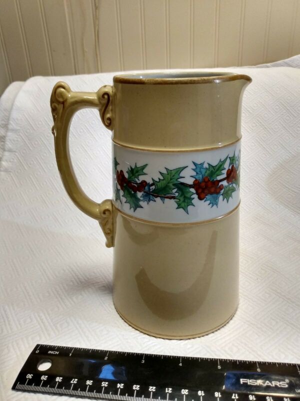 Antique Yellowware Ironstone Holly Berry Christmas Farmhouse Pitcher Saxon