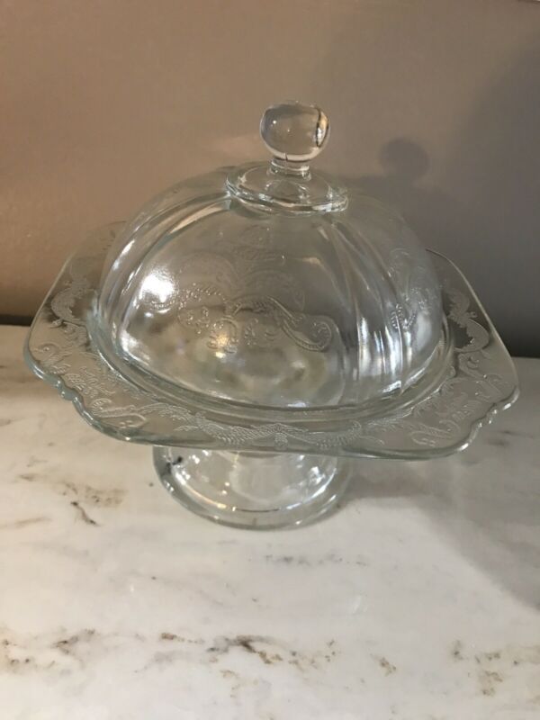 Nice Vintage Depression Clear Glass Round Top Butter Dish On Pedestal
