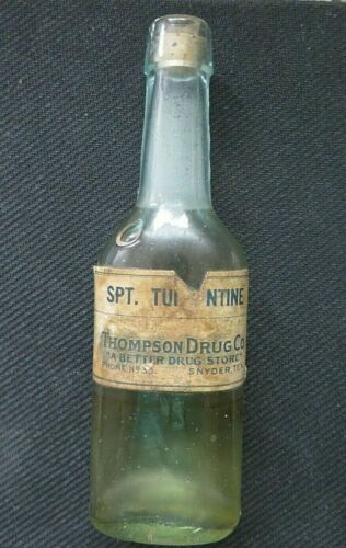 Title (ebay affiliate link): SPT. TURPENTINE - THOMPSON DRUG CO SNYDER TX - PAPER LABEL - GREEN GLASS BOTTLE
