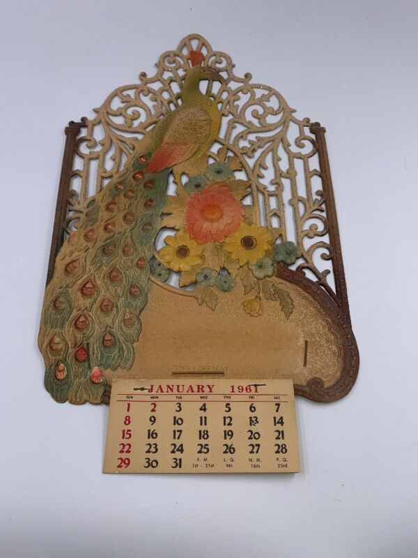 Title (ebay affiliate link): Large Vintage Die Cut Peacock Embossed Calendar Art Deco West Germany Beautiful
