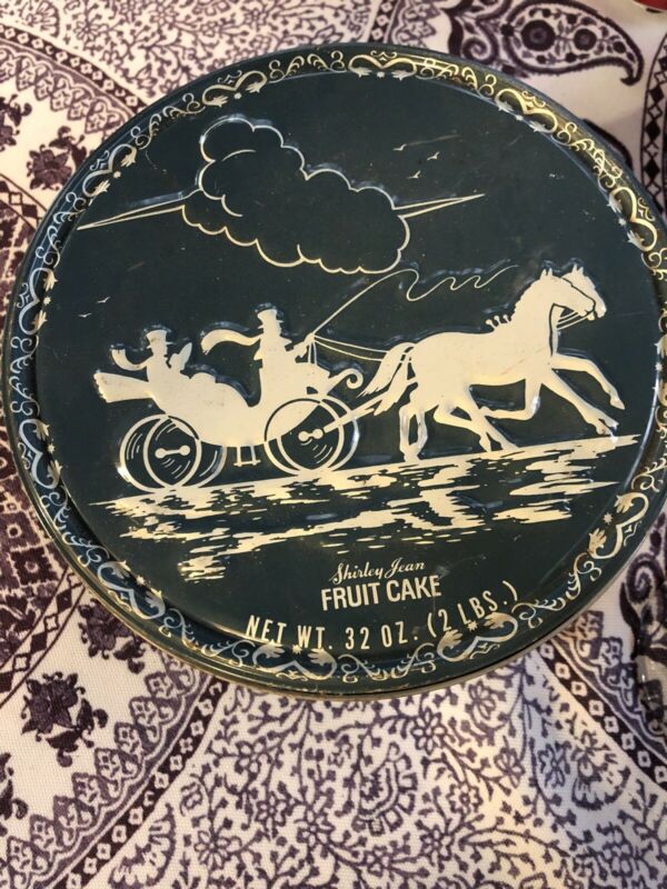 Title (ebay affiliate link): Vintage Shirley Jean Fruit Cake Horse & Carriage Metal Tin Blue Embossed