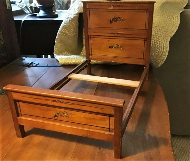 Title (ebay affiliate link): VTG Wooden Doll Bed w/ Hand Painted Stencil Design on Head Footboard Sides