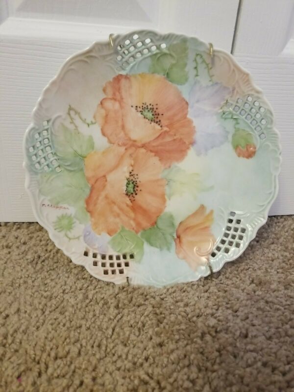 VTG Poppies Flowers Porcelain Plate Hand Painted SIGNED