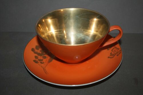 VINTAGE DOROTHY THORPE MID CENTURY ORANGE AND GOLD TEACUP & SAUCER SET (6)