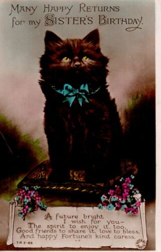 VINTAGE BIRTHDAY GREETING postcard: BLACK KITTEN CAT WITH A BLUE BOW
