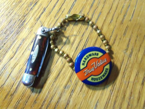 VINTAGE CELLULOID ADVERTISING TRUE VALUE HARDWARE BUTTON KEYCHAIN & SCOUT KNIFE